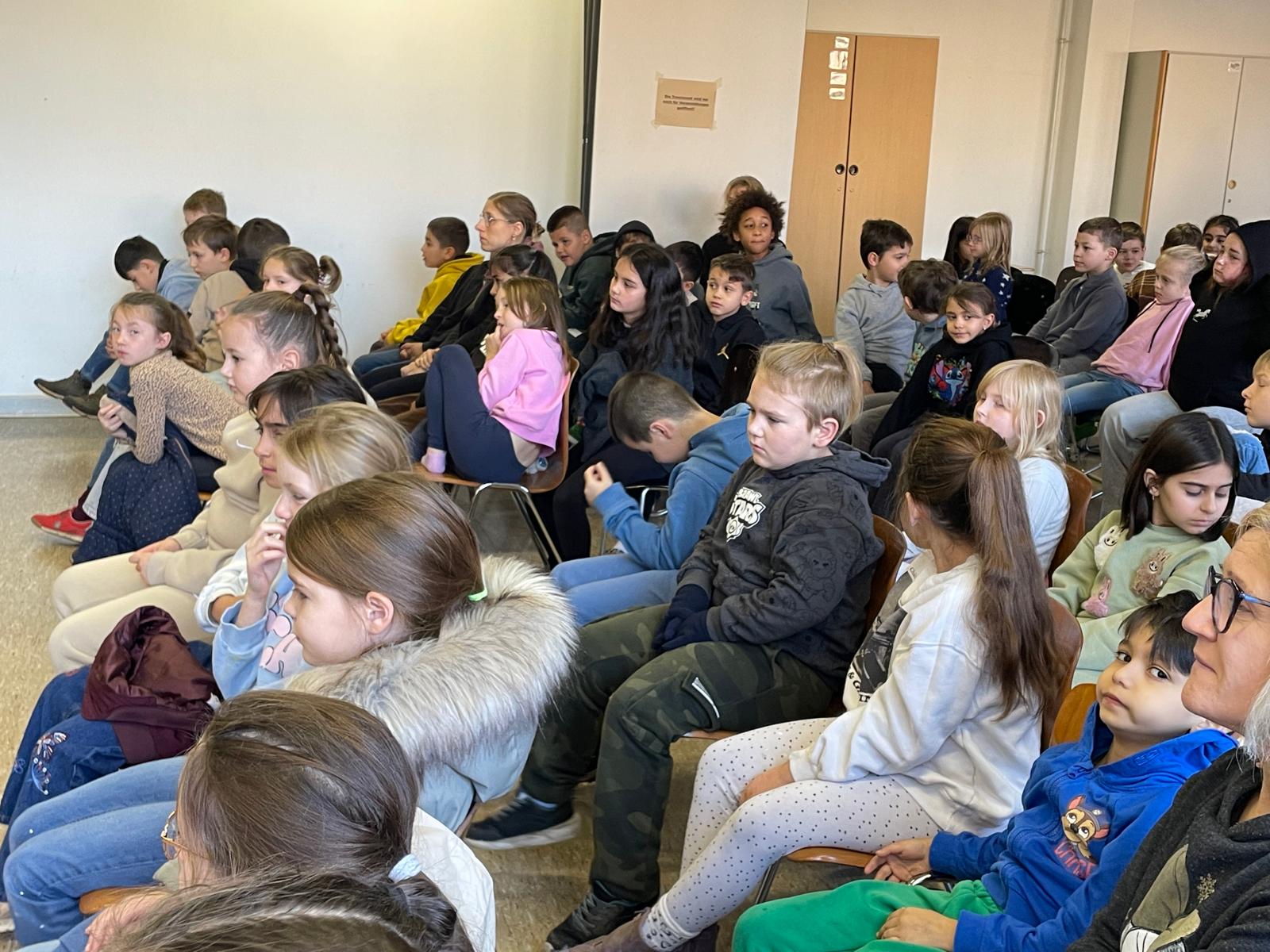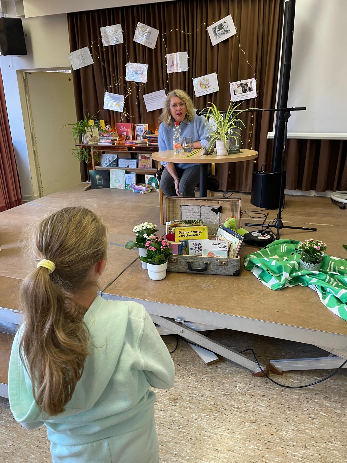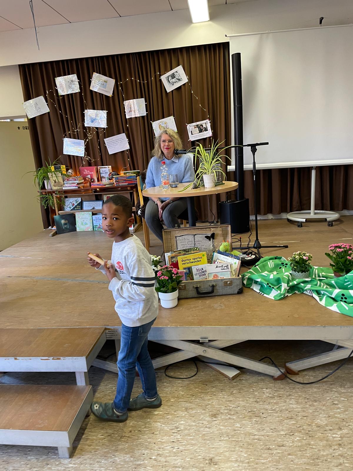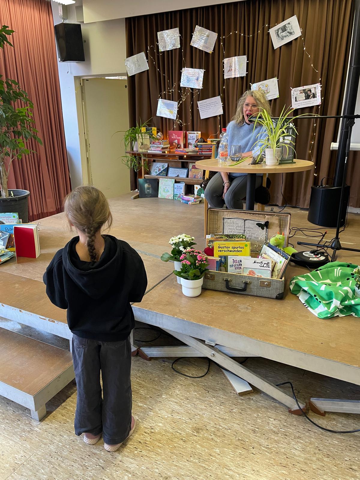 Die Landtagsabgeordnete Annette Schütze, begleitet vom Fraktionsvorsitzenden aus dem Bezirksrat Hans Peter Rathjen besucht uns und liest aus dem Buch „Die Geschichte vom kleinen Onkel“ vor. Die Zweitklässler:innen aus allen sechs Klassen sind gespannt und blicken zur Bühne. Frau Schütze sitzt, umrahmt von vielen unterschiedlichen Büchern, Lichterketten, verschieden drapierten Tüchern am Mikrofon, liest, nimmt die Kinder mit, indem sie Fragen an passenden Stellen einwirft und Antworten mit einbezieht.