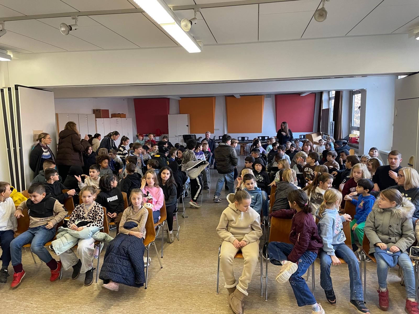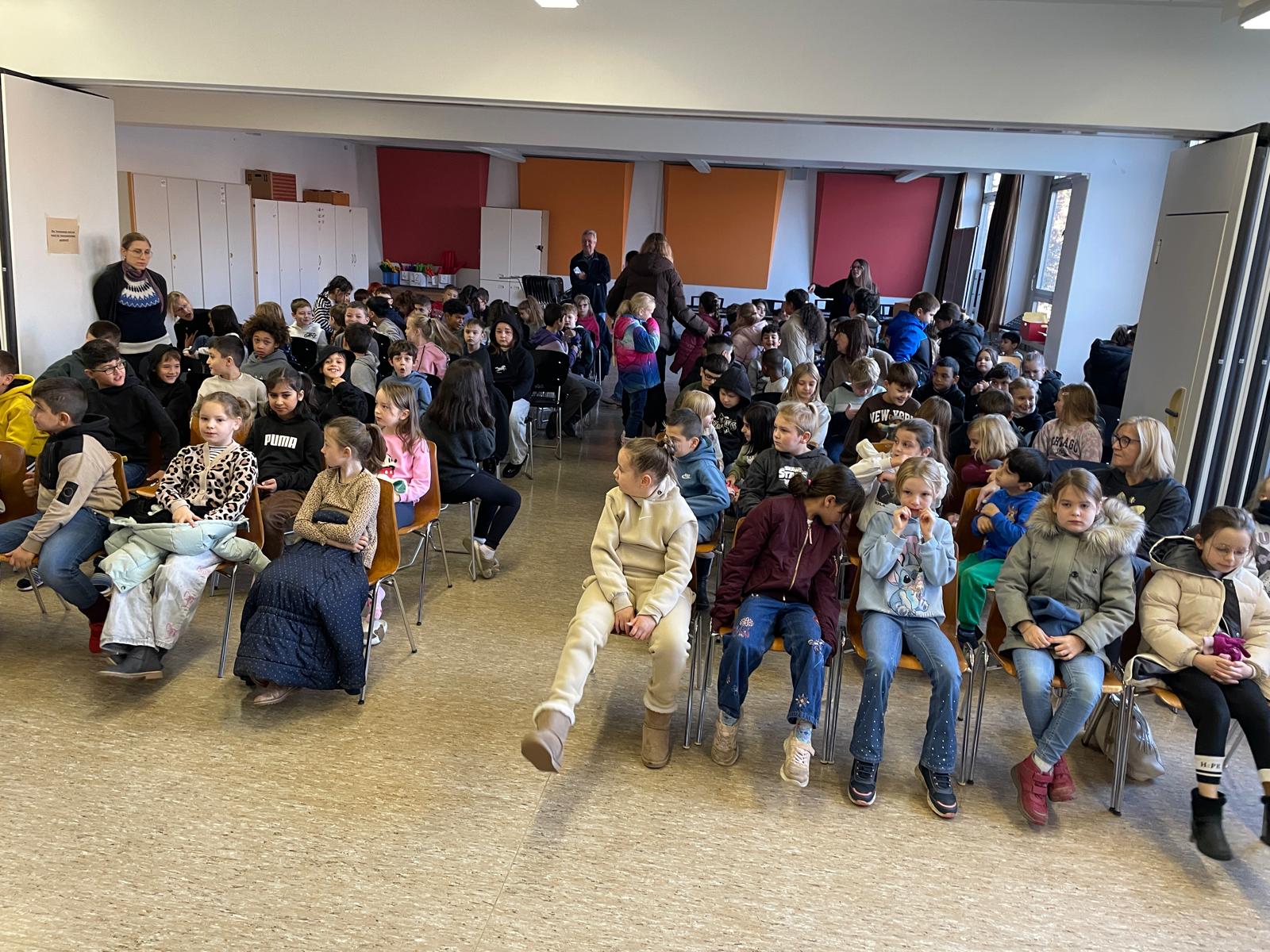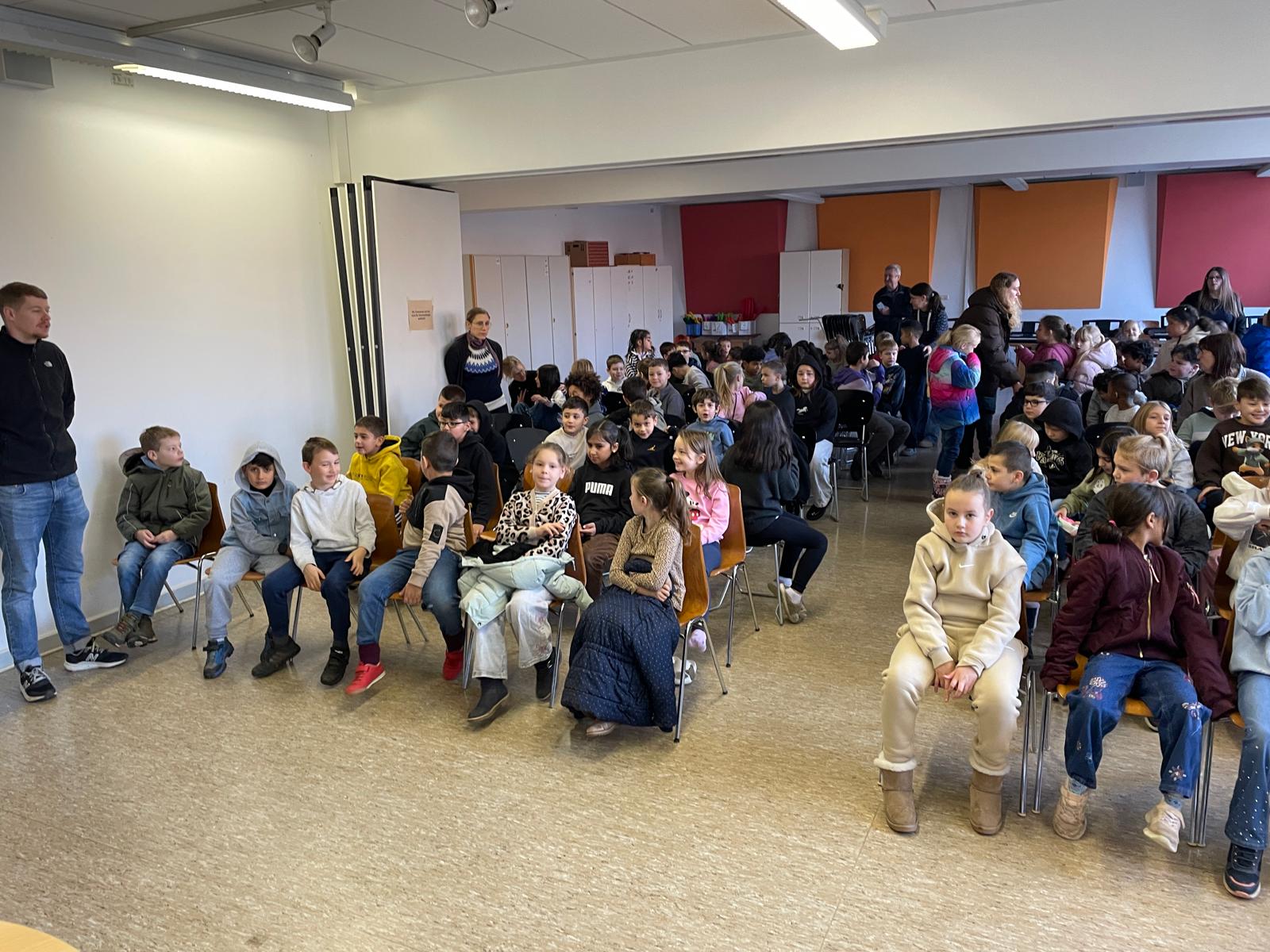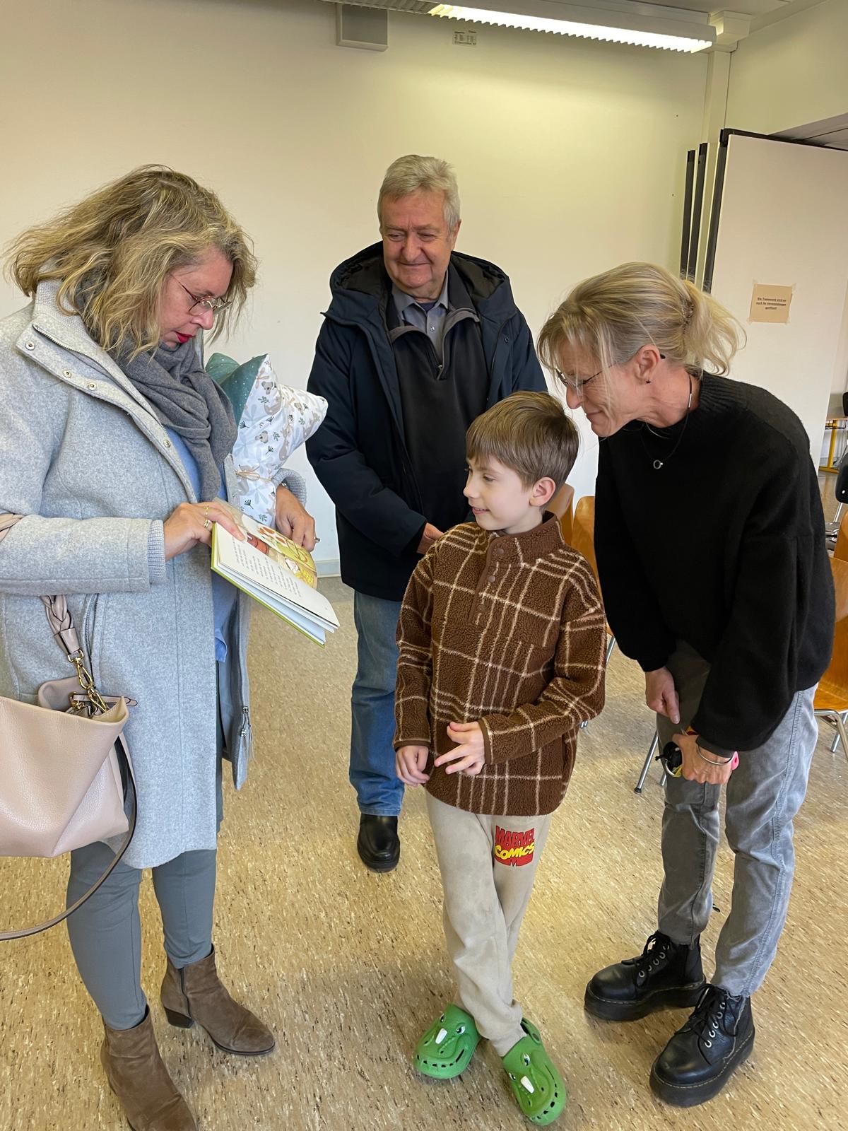 Die Landtagsabgeordnete Annette Schütze, begleitet vom Fraktionsvorsitzenden aus dem Bezirksrat Hans Peter Rathjen besucht uns und liest aus dem Buch „Die Geschichte vom kleinen Onkel“ vor. Die Zweitklässler:innen aus allen sechs Klassen sind gespannt und blicken zur Bühne. Frau Schütze sitzt, umrahmt von vielen unterschiedlichen Büchern, Lichterketten, verschieden drapierten Tüchern am Mikrofon, liest, nimmt die Kinder mit, indem sie Fragen an passenden Stellen einwirft und Antworten mit einbezieht.