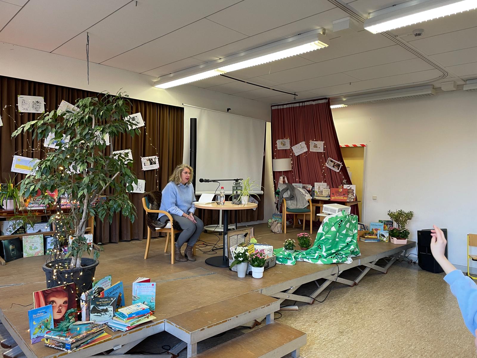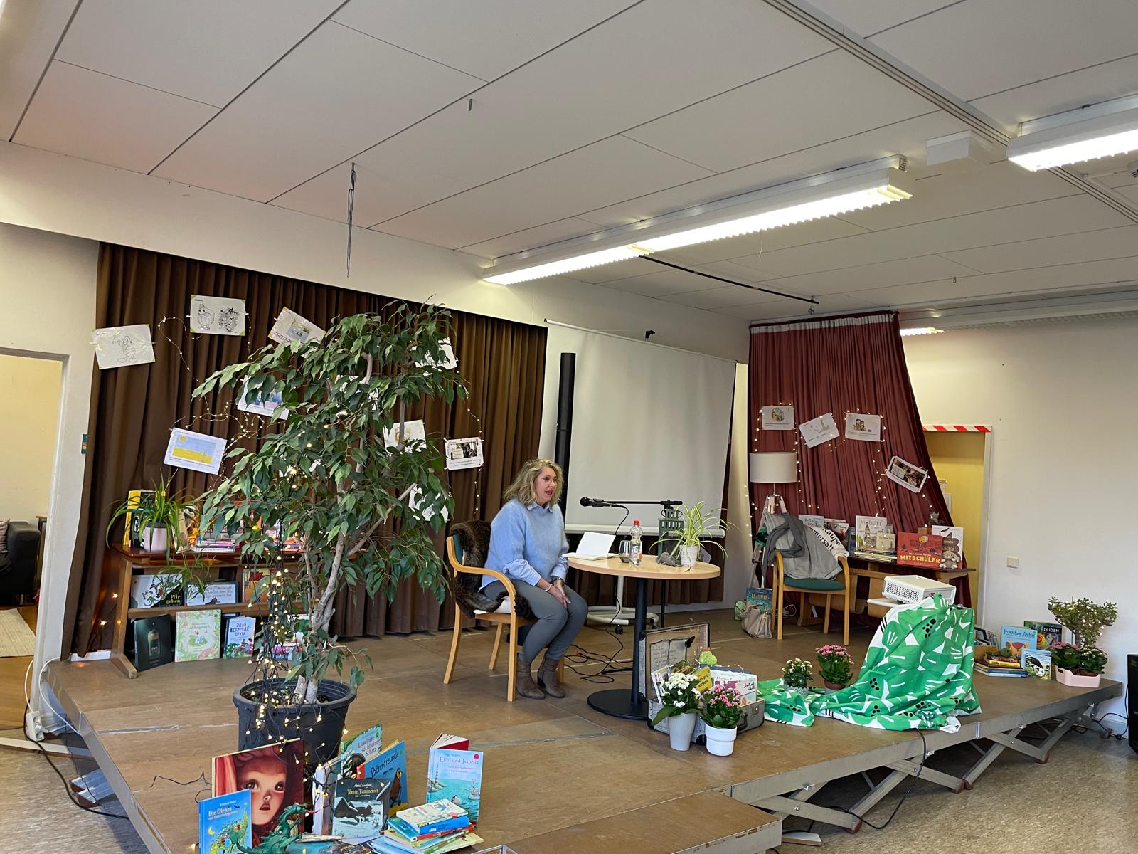 Die Bühne ist ein wunderschöner Rahmen, der die passende Atmosphäre bietet. Ein großer Dank an unsere Schulsozialarbeiterin Svenja Schmidt und Lehrerin Frau Ksoll, die im Vorfeld mit viel Liebe dieses Bühnenbild und die Lesung möglich gemacht haben.
